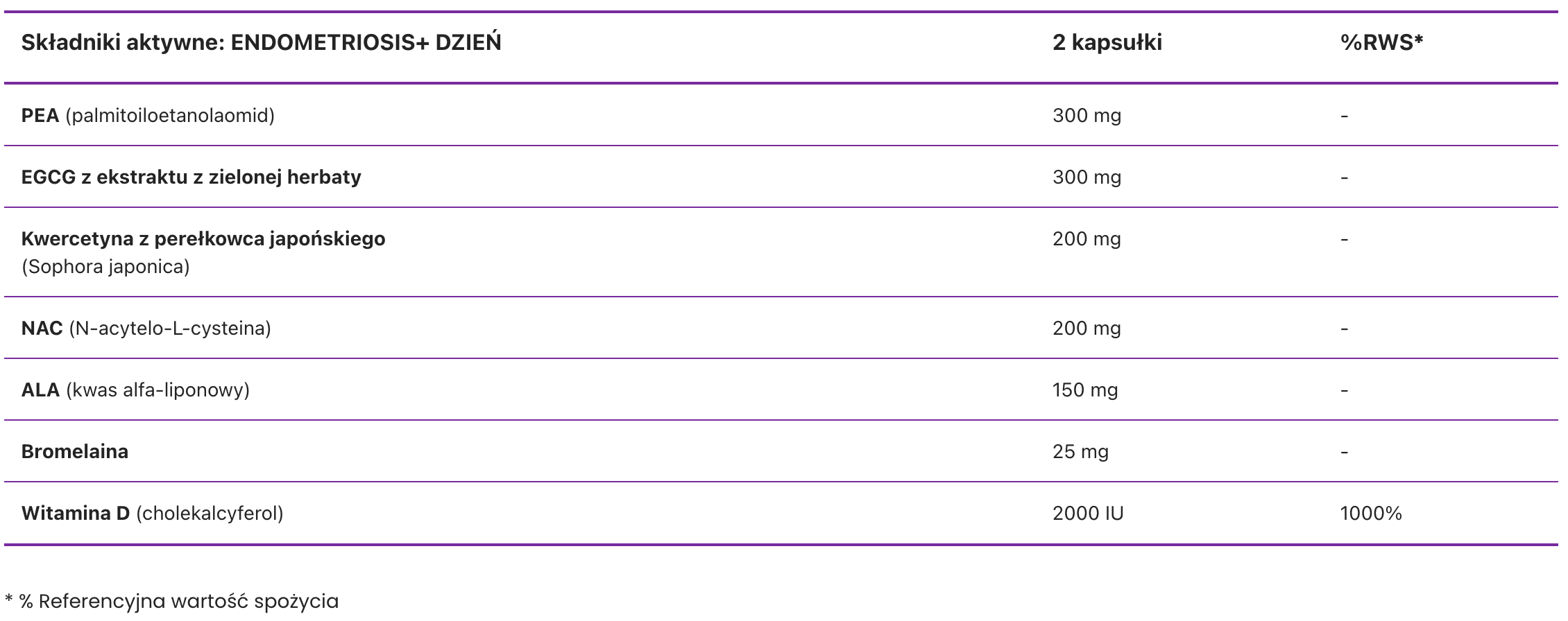 Składniki aktywne: ENDOMETRIOSIS+ DZIEŃ | 2 kapsułki | % RWS* |